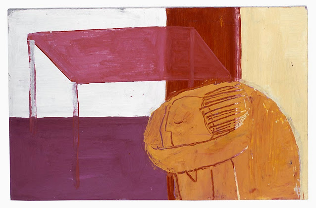 The series AG II are mainly paintings on paper and cardboard and are referring on personal experiences and recounts of important autobiographic pieces of my life. The compositions are consisted by people that are watching others, that are keeping or telling secrets. They are inside empty but colourful rooms laying on top of table-beds or underneath organ-like objects. The symbolic shapes are standing between reality and fiction as the only realisation of what actually happened.